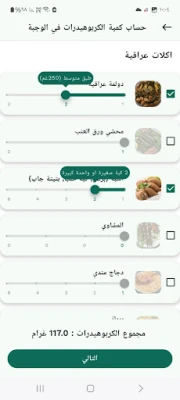 يُدخل المستخدم مكونات الوجبة لحساب إجمالي الكربوهيدرات (بالغرام).